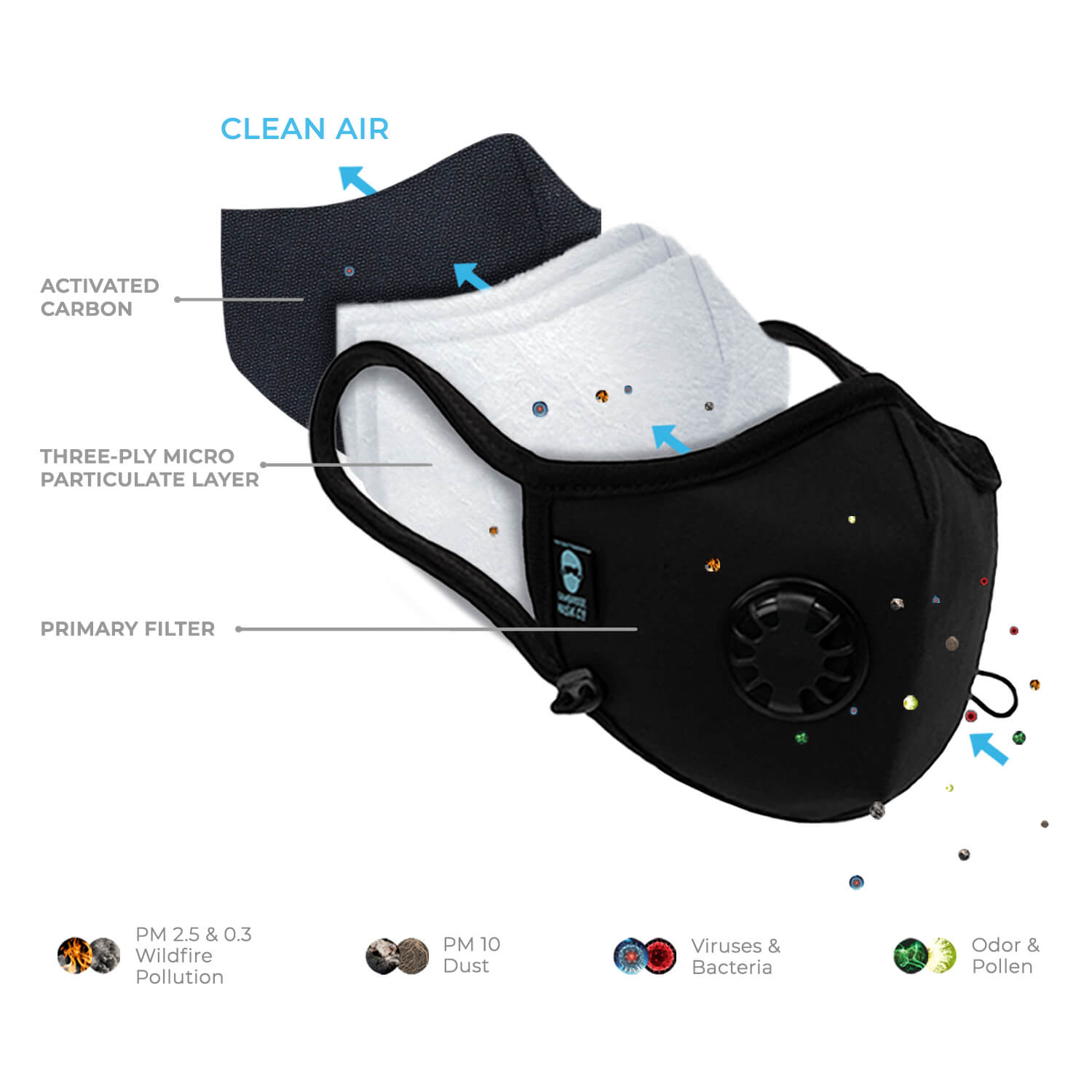 The Cambridge Mask employs a series of filters designed to ensure only the cleanest possible air. Composed of a total of three layers, each layer acts as a barrier to the various pollutants typically found in both indoor and outdoor air. The three-layered filter system is made up of a Primary Filter, a Three Ply-Micro Particulate Layer, and a Military Grade Activated Carbon Filter.
